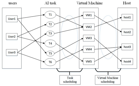 Edge AI data-intensive computing tasks in IoT can be described as a combination of data-intensive jobs and common sensing tasks [27]. Users submit AI computation task queues to the edge network cluster, and the network edge side of the end device establishes a certain number of virtual machines through virtualization technology to form an edge network cluster. When the edge cluster receives a task request, it assigns the AI data-intensive computation tasks to n virtual machines for execution through a suitable intelligent scheduling algorithm, and finally, the distributed results are combined and returned to the user. For example, a certain task scheduling scheme a represents the mapping relationship from computational tasks to virtual machines, and then six computational tasks are assigned to five edge cluster virtual machines for execution when ; the mapping relationship between tasks and virtual machines is shown in Figure 1.