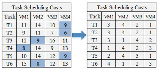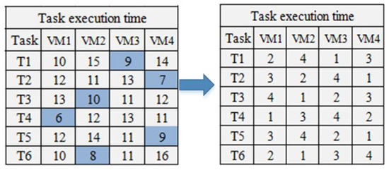 The algorithm consists of the main process of PSO. Based on the PSO algorithm, the process of selecting the best position of the particle by processing the objective function is changed. First, the execution time of each task to reach the available VMs, the maximum completion time and the scheduling cost are calculated according to Equations (9)–(11). The steps in line 3 to line 19 represent the main function of the PSO algorithm based on the goal ordering. The main loop traverses all particles to find the best scheduling solution, and the PSO algorithm is improved by adding a sorting function to compute the fitness value. Specifically, in line 3, the particle population, velocity, position and task scheduling best solution Pbest are initialized; lines 6 to 14 describe the main steps to evaluate the objective function using the goal-ranking approach. In line 6, the sorted list is initialized; lines 7 to 9 calculate the fitness values for each objective, sorting the execution time, scheduling cost and maximum completion time of each task in ascending order, respectively, and storing each result in a separate matrix to select the VM number with the smallest value. Row 11 calculates the sum of the objective function values of the corresponding VMs for each task in the three matrices by cycling through all VMs. Row 13 sorts the sums of the three optimization objectives in ascending order. Line 14 selects the VM with index 0 based on the ascending queue; i.e., the VM with the smallest value. Line 15 compares the fitness value of each particle with the individual particle best using the evaluation function and returns the particle best (pbest). Line 16 updates the velocity and position of the particles in each iteration according to Equations (13) and (17). For a clearer understanding of the algorithm, assume that there are six tasks to be reasonably assigned to four virtual machines, and calculate the three optimized objective function values according to Equations (9)–(11), respectively. The process of task selection of VM is shown in Figure 2, Figure 3, Figure 4 and Figure 5.