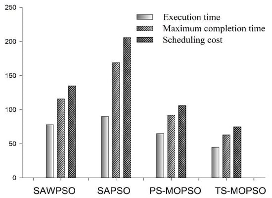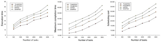 Figure 7 shows the experimental comparison trends of the four different algorithms in terms of task execution time, maximum completion time and scheduling cost. It can be seen that the TS-MOPSO achieves the best performance in terms of execution time, maximum completion time and scheduling cost, and its superiority over other algorithms becomes more obvious as the number of tasks increases. In addition, experiments also demonstrate that the combination of multi-objective optimization techniques and particle swarm algorithms is more suitable for solving multi-objective task scheduling optimization problems. SAWPSO uses an adaptive inertia weight update strategy to prevent particles from falling into local optima during iteration, so the overall performance of this algorithm is better than that of SAPSO. Both PS-MOPSO and TS-MOPSO use a nonlinear inertia weight update method and introduce a shrinkage factor update mechanism to balance the performance of the algorithm. Both PS-MOPSO and TS-MOPSO use a nonlinear inertia weight update method, and introduce a shrinkage factor update mechanism to balance the local and global search ability of the algorithm, so that the optimal search ability of the particles in the solution space can be better optimized. The difference is that PS-MOPSO uses the Pareto-optimal method and finds the optimal scheduling solution by multiple comparisons in the Pareto-optimal set, and the number of comparisons increases with the number of optimization objectives, which leads to more time required for processing multiple objectives. In contrast, TS-MOPSO uses an objective-based ranking method to overcome this drawback and improve the overall performance of the algorithm by simplifying the lookup to select the best VM.