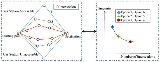 In many practical problems, such as economic, management, military, science and engineering design, it is often difficult to judge the quality of a scheme with one index, and more than one uncoordinated or even contradictory objectives must be considered simultaneously. Multi-modal multi-objective optimization problems are defined as the multi-objective optimization problems (MOPs) with at least two similar feasible regions in the decision space corresponding to the same region of the objective space []. In real life, it is critical to find all the Pareto optimal solutions in decision space simultaneously for the purpose of decision-making as well as a new challenge; for instance, it is in [] that the researchers described a real-world scenario: {Option 1, Option 2, Option 3} and {Option4, Option 5, Option 6} are two Pareto sets (PSs) that correspond to the same Pareto front (PF); however, the former go through a gas station while the latter do not. The gas station is needed for some travelers, while it is unnecessary and a nuisance with some potential safety risks for the others, as detailed in Figure 1.