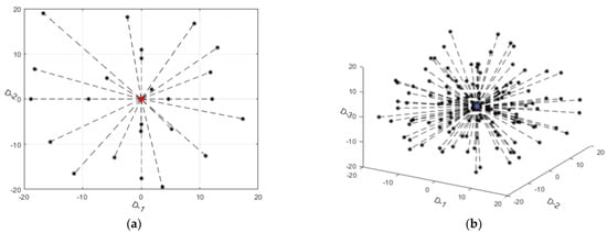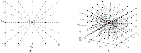 Schematic of the RASGS strategy. (a) Schematic when Dimension is 2 and K is set to 2 for Equation (7). (b) Schematic when Dimension is 3 and K is set to 3. (Both red point and blue point mean the current location while the black ones mean the ones to be inspected).