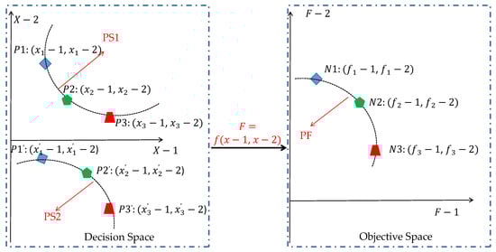 As mentioned above, MMPs have multiple inconsistent goals, making it impossible to compare the quality of different non-dominated solutions through traditional methods, so a global optimal solution like the single objective programming problem cannot be found, as shown in the Figure 4 where for N1, N2 and N3, the best solution cannot be compared due to the two independent evaluation objectives F-1 and F-2. Obviously, solution N1 (corresponding to P1 and P1′ in the decision space) is the best on target F-2 and the worst on F-1 (assuming the larger the better). On the contrary, solution N3 (corresponding to P3 and P3′ in the decision space) is the worst on target F-2 and the best on F-1. Solution N2 (corresponding to P2 and p2′ in the decision space) is in the middle value on objectives F-1 and F-2.