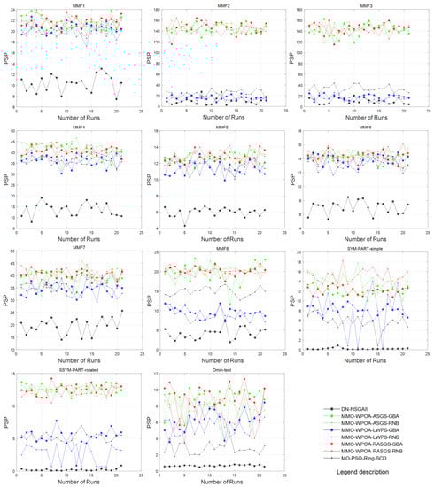 In terms of the optimal value or maximum value of PSP, it can be clearly seen from Table 5 that six records of MMO-WPOA-RASGS-GBA are better than MMO-WPOA-ASGS-GBA, five records are better than MMO-WPOA-ASGS-RNB and four records are better than MMO-WPOA-RASGS-RNB, and the difference between other records without advantages is very small. In particular, the former has the best performance in the more complex functions SYM-PART-rotated and Omni-test (with 9 and 27 Pareto sets, respectively, as detailed in Table 2). In terms of minimum or worst value for PSP, seven records of MMO-WPOA-RASGS-GBA are better than MMO-WPOA-ASGS-GBA, seven records are better than MMO-WPOA-ASGS-RNB and four records are better than MMO-WPOA-RASGS-RNB, and the difference between other records without advantages is very small, which means that the proposed method