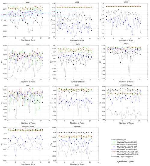In terms of the optimal value or maximum value of HV, it can be clearly seen from Table 5 that five records of MMO-WPOA-RASGS-GBA are better than MMO-WPOA-ASGS-GBA, eight records are better than MMO-WPOA-ASGS-RNB and nine records are better than MMO-WPOA-RASGS-RNB, and the difference between other records without advantages is very small, which means that MMO-WPOA-RASGS-GBA has an advantage rate of about 45.45%, 72.73% and 81.82% compared with the other three approximation algorithms. In terms of minimum or worst value for HV, nine records of MMO-WPOA-RASGS-GBA are better than MMO-WPOA-ASGS-GBA, nine records are better than MMO-WPOA-ASGS-RNB and six records are better than MMO-WPOA-RASGS-RNB, and the difference between other records without advantages is very small, which means that the proposed method MMO-WPOA-RASGS-GBA has an advantage rate of about 81.82%, 81.82% and 54.55% compared with the other three approximation algorithms. Similarly, in terms of median for HV, nine records of MMO-WPOA-RASGS-GBA are better than MMO-WPOA-ASGS-GBA, seven records are better than MMO-WPOA-ASGS-RNB and eight records are better than MMO-WPOA-RASGS-RNB, and the difference between other records without advantages is very small, which means that MMO-WPOA-RASGS-GBA has an advantage rate of about 81.82%, 63.64% and 72.73% compared with the other three approximation algorithms. Correspondingly, in terms of standard deviation for HV, five records of MMO-WPOA-RASGS-GBA are better than MMO-WPOA-ASGS-GBA, six records are better than MMO-WPOA-ASGS-RNB and six records are better than MMO-WPOA-RASGS-RNB, and the difference between other records without advantages is very small, which means that MMO-WPOA-RASGS-GBA has an advantage rate of about 45.45%, 54.55% and 54.55% compared with the other three approximation algorithms.