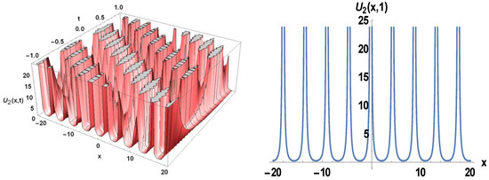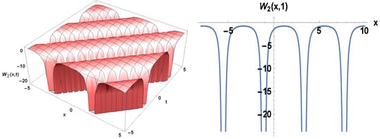 The modified exp-function method has been applied to obtain the solutions (25–44). These travelling wave solutions have been confirmed using Wolfram Mathematica 10. The same computer program was used to generate Figure 1, Figure 2, Figure 3, Figure 4, Figure 5 and Figure 6. Solitary waves of various forms, bell shape soliton, and smooth bell shape soliton, anti compacton soliton, periodic shape soliton, brilliant singular soliton, singular kink solitons, and further kinds of soliton solutions are among the practical solutions. The style of solitary waves has been visually shown in terms of space and time. We investigated the nature of the solution. The analytical solution’s graphs obviously show how the modified exp function method is more reliable and effective. When we solve the Riemann wave equation, we find a variety of solutions with different uncertain parameters. These unidentified factors have an influence on the nature of the findings; various sorts of solutions are created from a solution if parameters acquire different particular values. In the following, we demonstrated the impact of the solution-related factors. Figure 1 displays the hyperbolic function solution to the solitary wave to the single wave perspective to the 2D, and 3D plots of U1(x, t) and W1(x, t) being we achieve the bell shape and bright singular soliton solution respectively by considering the values within the interval for 3D surfaces and t = 1 for 2D surfaces. In Figure 2 we obtain the consolidated periodic solitons solution of U2(x, t) and W2(x, t) for the unidentified coefficients within the interval for 3D surfaces and t = 1 for 2D surfaces. Now hyperbolic function solution in U3(x, t) and W3(x, t) being we acquire the singular soliton and smooth bell shape soliton solutions respectively by considering the values within the interval and t = 0.1 for 2D surfaces in Figure 3. Figure 4 represents the periodic trajectory for the real and imaginary parts of the solitary wave view of 3D, and 2D plots of U6(x, t) for the unknown constants within the interval and t = 1 for 2D surfaces. Figure 5 demonstrates the solitary wave from the perspective of 2D, and 3D plots of U7(x, t) being that we receive a singular kink type wave solution, the anti compacton soliton solutions, a compact is true to the solitary wave having compacted support where the non-linear dispersion limits within a determinate core, resulting in the disappearance of the exponential annexes by considering the values and within the interval and t = 2 for 2D surfaces. Figure 6 shows that we acquire the periodic wave solution by considering the standards within the interval and t = 2 for 2D surfaces.