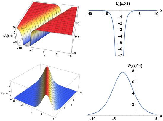 The 2D, and 3D plots of solitary wave of perspective view of U3(x, t) and W3(x, t).