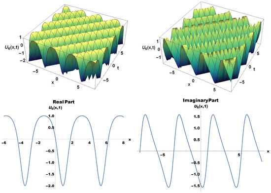 The real and imaginary parts of 2D, and 3D plots of the solitary wave of perspective view of U6(x,t).