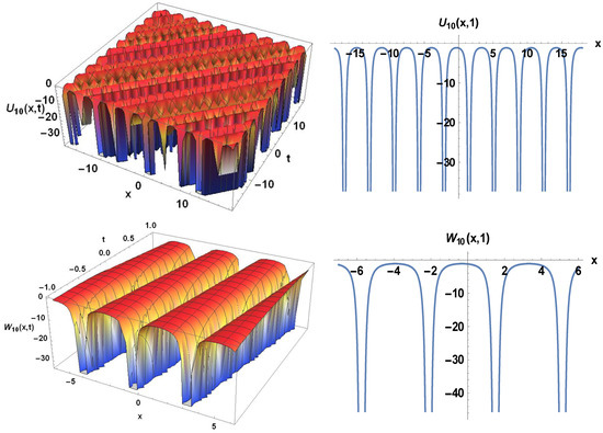 The 3D, and 2D plots of the solitary wave perspective view of U10(x, t) and W10(x, t).