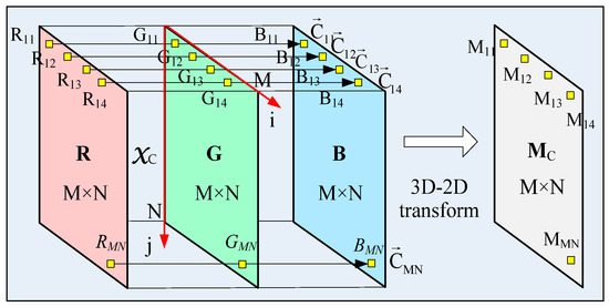 The transformation of the color tensor XC composed of matrices R, G, B each of size M × N with b bpp, into series of color vectors for i/j = 1, 2, …, M/N (vectorization of tensor XC), is presented in Figure 1. The so obtained vectors are symmetrical in respect to the input ones because they satisfy the requirement for rotation invariance (the direction of the input and the output vectors are the same). The vertices of the color vectors define the color space of the image.