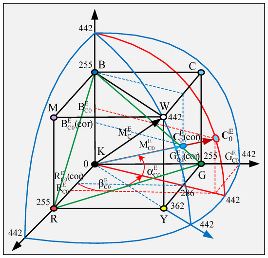 In Figure 2, the color space within the RGB cube in a sphere with radius MC = 442 for b = 8 bpp and the Maxwell’s triangle defining the reproducible colors on the screen are given.