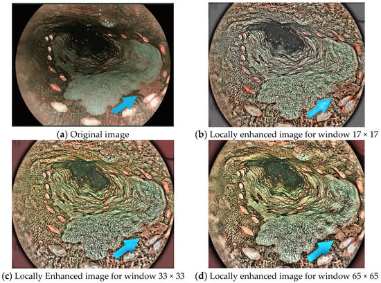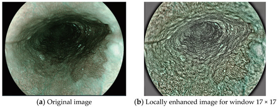 Some results of the application of the developed algorithms for local contrast enhancement of endoscopic images are shown in Figure 6, Figure 7 and Figure 8. The choice of the sliding window size for the local contrast enhancement is important from the point of view of increasing the contrast of smaller or larger details or objects in the image, which are important for doctors in the diagnosis of disease based on visual evaluation of the endoscopic images of the patient. Therefore, the paper presents contrast enhancement results at different window sizes of 17, 33, and 65 to illustrate the difference in contrast enhancement of smaller or larger details or objects in the selected test images.