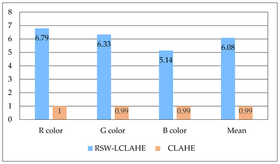 The comparison results for the MSDE values obtained through RSW-LCLAHE and CLAHE algorithms for Image 1 in accordance with row one from Table 2 and row one from Table 3, are shown in graphic form as an example in Figure 10.