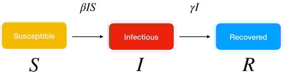 A concerted international effort over the past several years has sped the development of a worldwide monitoring network for averting pandemics of new and re-emerging infectious diseases. To swiftly examine potentially dangerous circumstances, researchers from a variety of fields—from medicine and molecular biology to computer science and applied mathematics—have worked together. In order to achieve this, mathematical modeling is widely utilized in the evaluation, management, and prediction of potential outbreaks. The impact of various factors, ranging from the microhost–pathogen level to host-to-host interactions, as well as prevalent ecological, social, economic, and demographic aspects present throughout the world, must be carefully investigated in order to better understand and predict contagious dynamics. However, by recommending treatment options, mathematical modeling may be a useful tool for understanding disease processes and predicting their spread. The major focus of epidemiology is to study diseases that spread. Epidemiology is concerned with tracing and studying the variables that contribute to the spread of illnesses through time in order to establish potential controls. Understanding the behavior of infectious illnesses is aided by mathematical modeling. For a long time, several mathematical epidemiology models have been studied. Kermarck and McKendrick developed the first compartment model for epidemic infectious illnesses []. Typically, in epidemic models, the population is separated into several classes or compartments. The fundamental SIR epidemic model is used to split the population into three different groups, which are susceptible S, infected I, and recovered R people, in order to analyze the dynamics of infectious illnesses. Individuals’ transit from one compartment to another in this model is dictated by their capacity to combat infections and their contact with sick people []. Figure 1 illustrates what the SIR model looks like, where () and () are the parameters of the model.