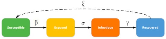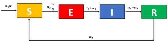 The fundamental SIR model denotes a system with three nonlinear first-order differential equations. A latent stage of many illnesses occurs when a person is sick but not yet contagious. By including the exposed population E and allowing infected (but not yet infectious) people to travel from S to E and from E to I, the SEIR model is produced when an exposed compartment E is included in the SIR model. In contrast to a SIR model, which has no latency, the secondary spread from an infected individual will happen later because the latency delays the start of the individual’s infectious phase. As a result, a longer latency time will cause the outbreak’s initial progress to be slower. However, since the model does not include mortality, the basic reproductive number does not change. To see what the SIER model looks like, one may refer to Figure 2, where , , , and  are given parameters.