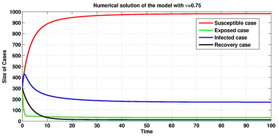 In order to highlight the numerical solution of the fractional-order COVID-19 model given in (6), obtained by using the fractional Euler method, Figure 4 shows the susceptible, exposed, infected, and recovered classes’ behavior over 100 days, along with taking the fractional-order value .