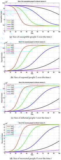 Here, we can observe that a symmetrical aspect appears in the susceptible and recovered subpopulations. In order to see how the approximate solutions for all classes of our proposed model look, Figure 5a–c illustrate such solutions that represent the whole size for each susceptible, exposed, infected, and recovered person over the time t. These figures are generated in light of several fractional-order values. In particular, Figure 5a represents the size of the susceptible people, which shows their decreasing state over 100 days. Figure 5b shows that the exposed cases are expected to be increasing over the same period. The infected cases are shown in Figure 5c, in which they are expected to also be increased. Finally, the recovery of people is expected to be increased over time, as shown in Figure 5d.