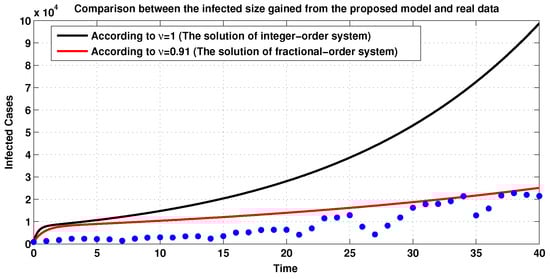 With the aim of evaluating the performance of the fractional-order model (4) and its impacts, we make certain predictions by using such a proposed system based on a numerical comparison that was performed between its dynamics and some real data collected from Jordanian society over 40 days; from 1 January 2022 up to 10 February 2022, (see https:corona.moh.gov.jo/ar). Actually, this numerical compassion, which can be shown in Figure 6, is considered one of the main focuses of this work. For instance, Figure 6 reveals that the fractional-order COVID-19 model (4) is better than the traditional integer-order model (3), especially when we make a comparison between its dynamics and certain real data collected throughout the mentioned period. In other words, we note that these data aggregate and come closer to the infected cases curve of the system (4) more than they aggregate and come closer to the infected cases curve of the system (3). This means that the fractional-order model (4) formulated at  has proved its efficiency in describing the dynamics of the infected cases against the integer-order system (3). This outcome will undoubtedly enable specialists to predict the number of infected cases that may be correctly detected in the whole of a society, and hence allow decision makers and influencers to set the right plans and logical strategies that should be followed to face this pandemic.