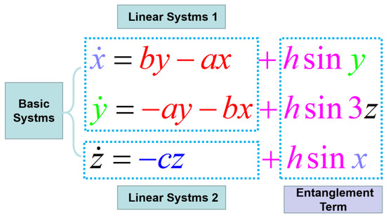 where x, y, and z represent state variables, a, b, c, and h are system parameters, and sin3z, cosx, and siny are entangled terms as dynamic systems. The construction process of the entanglement-chaos system is shown in Figure 1.