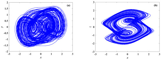 Attractor trajectory diagrams of System (3). (a) x−y phase diagram; (b) x−z phase diagram.