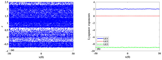 Set a = 2, b = 10, c = 3, and h = 18, [x(0), y(0), z(0)], as the initial conditions of the state variables, the values of which are [x(0), 2,3], and set x(0) to change between −50 and 50 with a change step of x(0) of 0.1. The bifurcation diagram and LEs of System (3) are shown in Figure 3. It can be seen that the x(0) change has no effect on the system, that is there is no multistable phenomenon in System (3).