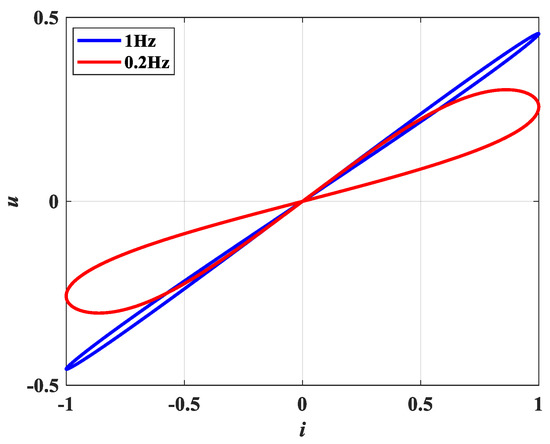 where α and β are the parameters of the memristor model and are greater than 0. Figure 3 shows the voltage–current relationship of the memristor model with α = 2, β = 0.09 under a frequency f = 0.1 Hz and 1 Hz. It can be seen from Figure 4 that the current–voltage volt-ampere characteristic curve of the memristor is symmetrical.