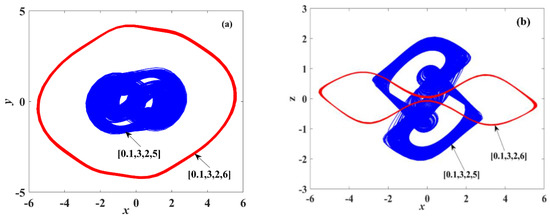 System phase diagram trajectory in different projections of chaotic System (5) from initial values (0.1, 3, 2, 5) and (0.1, 3, 2, 6). (a) System phase diagram trajectory in the x−y plane; (b) system phase diagram trajectory in the x−z plane.
