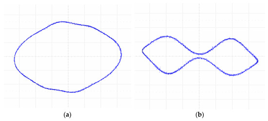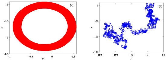 where , and we draw the trajectory in the p-s plane. In the p-s plane, if the bounded trajectory is periodic and if it is similar to the unbounded trajectory of Brownian motion, it indicates that the system is chaotic. This method is used to study the x sequence of memristive System (5). Its parameters are the same as those in Figure 3. The obtained p-s diagram is shown in Figure 6. Figure 6a is a bounded regular graph, then the system trajectory is periodic. Figure 6b shows a similar Brownian motion, so the system trajectory is chaotic.