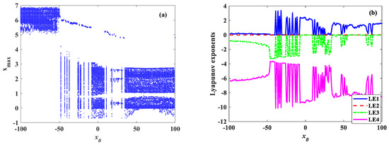 First, x(0) is selected as the variable control parameter. Fix a = 2, b = 10, c = 3, h = 18, α = 2, and β = 0.09, x(0) from −100 to 100 with a step size of 1, and the initial values as [x(0), 3, 2, 5]. The bifurcation diagram is shown in Figure 7a, and its corresponding LE result is illustrated in Figure 6b. From Figure 7, It can be seen that, when the initial value changes, the nonlinear dynamic characteristics of the system are complex, with many coexisting attractors and multistable behaviors. When the parameter , System (5) shows a periodic state. When , System (5) is in a chaos state and a periodic state appears alternately. When System (5) is in a periodic state, the LEs are equal to 0. When System (4) is in a chaotic state, the largest LEs are positive, as shown in Figure 7b.
