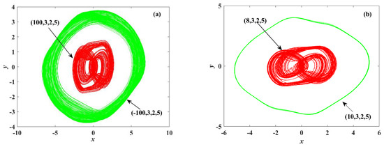 Various coexisting attractors with different values. (a) x(0) = −100 and x(0) = 100; (b) x(0) = 8 and x(0) = 10.