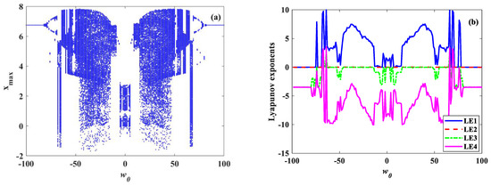 Fixing the parameters a = 2, b = 10, c = 3, h = 18, α = 2, and β = 0.09, w(0) from −100 to 100 with a step size of 1, and the initial values set as [0.1, 3, 2, w(0)], the bifurcation diagram is shown in Figure 9a, and its corresponding LE result is illustrated in Figure 9b. From Figure 9, we can see that the system has complex chaotic characteristics, and the phenomenon of coexisting attractors appears. When parameter , System (5) shows a periodic state. When , System (5) is in a chaotic state, and a periodic state appears alternately. When System (5) is in a periodic state, the maximum LE is 0. When System (5) is in a chaotic state, the largest LEs are positive, as shown in Figure 9b.