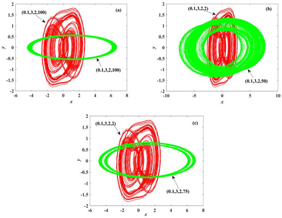 When and , System (5) presents e as a chaotic and periodic state, its coexisting attractor is shown in Figure 10a. When and , the system is in a chaotic state, and its coexisting attractor is shown in Figure 10b. When and , System (5) presents e as a chaotic and periodic state, and its coexisting attractor is shown in Figure 10c.