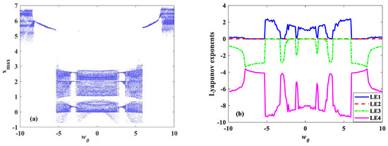 Fixing the parameters a = 2, b = 10, c = 3, h = 18, α = 2, and β = 0.09, w(0) from −10 to 10 with a step size of 0.1, and the initial values [0.1, 3, 2, w(0)], the bifurcation diagram is shown in Figure 10a, and its corresponding LE result is illustrated in Figure 11b. From Figure 11, we can see that the system has complex chaotic characteristics, and the phenomenon of coexisting attractors appears. When the parameter , System (4) shows a periodic state. When System (5) is in a periodic state, the Lyapunov exponents are equal to 0. When System (4) is in a chaotic state, the largest LEs are positive, as shown in Figure 11b.