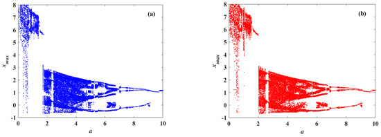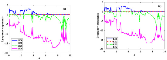 Fix the parameters b = 10, c = 3, h = 18, α = 2. and β = 0.04, and let the parameter a change in the range of [0, 10]. Figure 12 shows the bifurcation diagram and LEs of the system under two different initial conditions. The bifurcation diagram of the system with initial conditions of [0.1, 3, 2, 5] is shown in Figure 12a, and the bifurcation diagram of the system with initial conditions of [0.1, 3, 2, 6] is shown in Figure 12b. Figure 12c,d show the Lyapunov exponent spectrum. According to Figure 11, under two different initial values, with the decrease of parameter a, the system enters chaos through the period-doubling bifurcation road, and the bifurcation diagram is similar to the Les; however, the details are different. Obviously, in a ∈ [0, 2], the chaotic region of x (0) = 5 is larger than that of x(0) = 6.