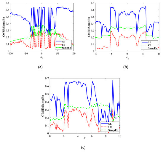 Complexity of the system with the parameters varying. (a) x0 varying; (b) w0 varying; (c) a varying.