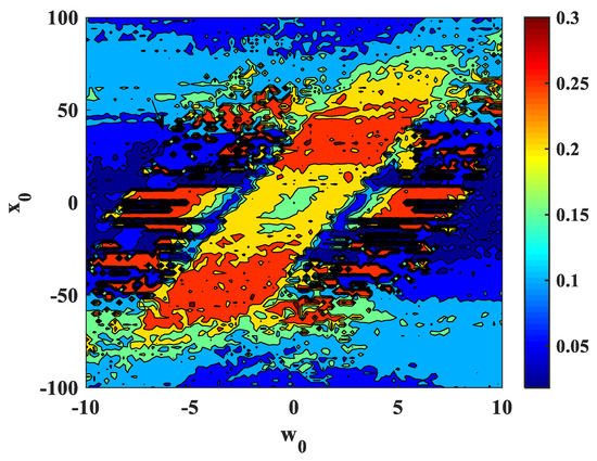 The C0 complexity diagram indicates the variation of the C0 complexity with initial condition [x(0), 3, 2, w(0)] and x(0) and w(0) changing, as shown in Figure 14. As can be seen from Figure 14, from the color bar on the right side of the figure, different colors represent complexity, that is the color ranges from blue to red and the complexity ranges from 0.05 to 0.3. A high-complexity area means that the system is chaotic or hyperchaotic, but the complexity diagram cannot show the details, such as the inability to distinguish periodic from chaotic.