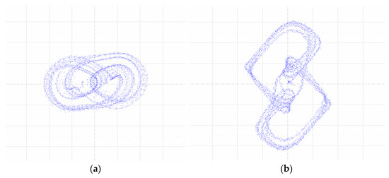 Especially when and , System (5) presents two chaos states, and its coexisting attractors are shown in Figure 8a. When and , the system is in a chaos and a periodic state, and its coexisting attractors are shown in Figure 8b.