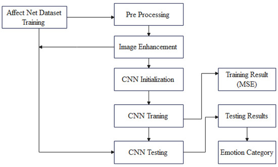The sensitivity of the model is observed during the evaluation of different models. And it is observed that with the usage of softmax as activation fiction, models dropped sensitivity. While with the use of the sigmoid function, better sensitivity is achieved. Improving the CNN algorithm’s accuracy requires extensive training sessions. Therefore, the amount of false Retraining in different parts of the dataset reduces the positives in emotion identification. These groups contain many images that are labeled based on their emotional content. Once the initial training phase is complete, the inaccurate examples of emotion recognition are manually filtered and blended into the next training cycle. Since this is the case, the proposed CNN architecture achieves the highest accuracy possible while simultaneously decreasing the frequency of false positives in emotion identification. Detection cases are manually filtered and blended into the next training cycle. As a result, the accuracy is maximized with reduced false emotion detection of the proposed CNN architecture. The CNN Training Algorithm is presented in Figure 6.