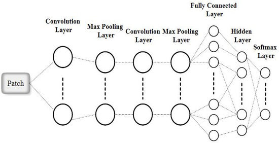 This is because a single convolution layer does not offer enough details. However, the model’s complexity and training time rise when more than three convolution layers are included. Researchers claimed that using as many pooling layers as possible results in the best performance in most situations to compare models with two and three convolution layers. The dropout value is utilized in a neural network simulation to make the model more universal. A hidden layer follows the single, entirely connected layer at the center of the design. The total number of nodes in the hidden layer must be considered from the beginning of the plan. The suggested model has a similar layout but different parts. There were initially only three convolutional layers. You can only utilize a 2 × 2 × 2 pool due to the concept’s intricacy. We used a variety of patch sizes to identify the ideal structural arrangement. The definition of a “moderate” patch size was examined using a variety of patch sizes. A 3 × 3 × 3 filter could fit three convolutional layers on the surface. The complexity of the models rose along with the size of the filters. Finally, the maximum size of the pooling layer used was determined to be 2 × 2 × 2. Different patch sizes were examined throughout training, but 24 by 32 by 32 was the best arrangement [41]. The General Architecture of the Convolutional Neural Network is presented in Figure 4.