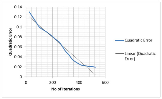 The proposed CNN (Convolutional Neural Network) method required 550 rounds of training before being suggested. Convolutional neural networks benefit from additional training iterations because they reduce training mistakes. The learning factor is 0.45, while the momentum is 0.75. A convolutional neural network’s training step involves evaluating the precision of a quadratic error prediction. The observed quadratic error values are shown in the Figure below. After the last iteration, the quadratic error is found to be 0.01920. This illustrates the operation of deep learning and is the minor quadratic error that is feasible. The proposed system’s training time is 118 min, while the average testing time for an unknown test input is 19 s. We have ignored the training time due to our focus over accuracy. The Mean Square error after Algorithm training is presented in Figure 7.