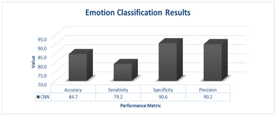 According to the results of the testing dataset, the algorithm successfully detected 8487 cases and misclassified 1531 instances. Using these details given in the Table 3, accuracy is calculated. After various tests, the sensitivity and specificity of the proposed emotion detection system were assessed. The algorithm’s sensitivity correlates with how well it recognizes genuine emotions. Recognizing false-negative data is another crucial technique for figuring out specificity. The categorization algorithms we will examine below have false positives and negatives. According to the testing dataset results, the system correctly discovered 8487 incidents while incorrectly classifying 1531 others. As a result, the system achieved an accuracy of 84.72 percent and a sensitivity of 79.24 percent. The method also has a specificity of 90.64 and an accuracy of 90.2. The graphic below depicts a graph representation of the results. The results after Algorithm Testing are shown in Figure 8.