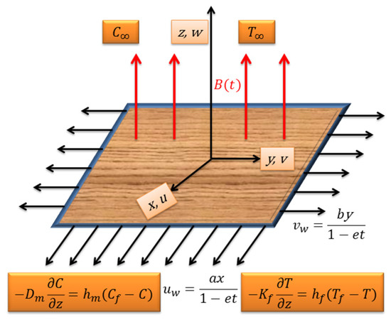Bidirectional unsteady stream of incompressible nanofluidic transport on a stretchable device placed in the plane (i.e., ). Mechanically, the device is extending in both locations with velocity along direction and velocity is applied towards direction. Here, extending rates are designated by and along respective directions with dimension [time]−1. The unsteadiness of the stretching device is estimated by the constant with dimension [time]−1 satisfying to create a balance with extending rates. A non-uniform magnetic field with strength is applied vertically upwards. Inductive effects are negligible by considering the magnetic Reynolds number so small. The modified Buongiorno nanofluid model is adopted to manipulate the significance of pedesis motion designated by coefficient and Ludwig–Soret labeled by coefficient of nanoparticles. The nonlinear form of the thermal radiation term is included. Heat source/sink is also linked with the thermal setup.