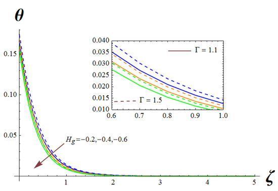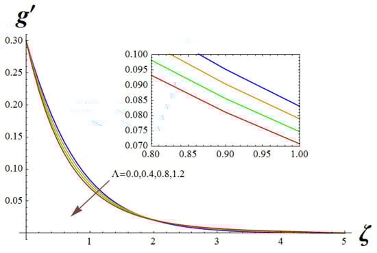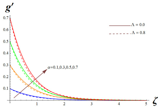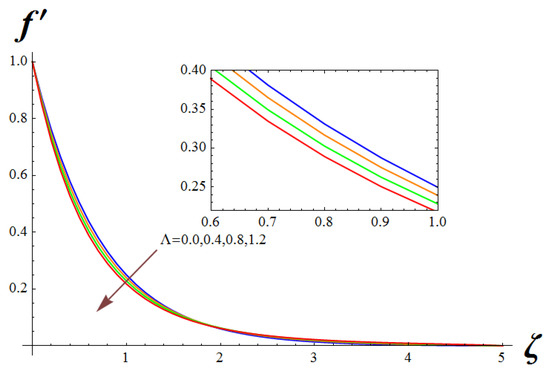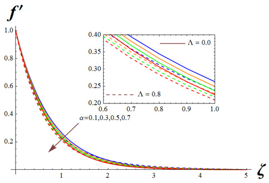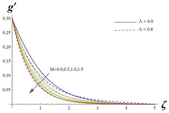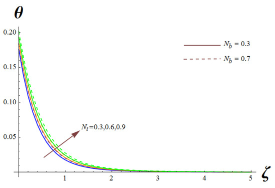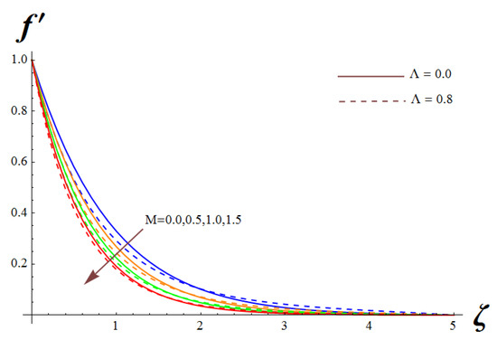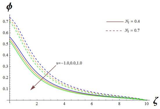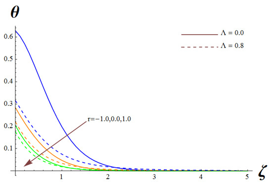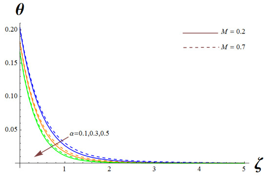 In graphical numbering, Figure 2 and Figure 3 show that the horizontal velocity aspect of both the x- and y-axis pathway of the nanofluidic transport features is a declining attribute of the unsteady parameter (Λ = e/a) within the range of 0.0 ≤ Λ ≤ 1.2. Due to the relationship between a and Λ, the augmentation of a in its positive sense of values boost Λ, which implies an incremental stretching rate. Consequently, the velocity of the nanofluid declines given the augmentation values of Λ. Furthermore, a decline is noticed for friction coefficients on both the x- and y-axis pathway as revealed in Table 3. Figure 4 presents the effect of the stretching parameter (α) on in the presence of the unsteady parameter (Λ) and in the absence of the unsteady parameter (Λ). The growing values of the stretching parameter (α) decreases with greater downfall in the presence of the unsteady parameter (Λ) than in the absence of the unsteady parameter (Λ). Given that (α = b/a), augmenting the values of the stretching parameter (α) connotes that the stretching ratio (a) along the x-axis diminishes, which results in decline of . Moreso, as reported in Table 3, the friction coefficient in the x-axis experiences a decline as the values of the stretching parameter increases. Figure 5 shows the effect of the stretching parameter (α) on . The growing values of the stretching parameter (α) increases with a greater upshot in the absence of the unsteady parameter (Λ) than in the presence of the unsteady parameter (Λ), which is expected from the mathematical relationship (α = b/a). Conversely, the friction coefficient in the y-axis drops as the values of the stretching parameter increases. The magnetic field (M) parameter range 0.0 ≤ M ≤ 2.0 in Figure 6 and Figure 7 establishes that the velocity component of both x- and y-direction nanofluidic transport processes diminishes with increased magnetic field values, with a concurrent greater downfall in the presence of the unsteady parameter (Λ) than in the absence of the unsteady parameter (Λ). The downfall of the velocity component is traceable to the Lorentzian force created by the augmentation of the magnetic field values. In addition, a downfall is reported for friction coefficients on both the x- and y-axis pathway as revealed in Table 3. Figure 8 demonstrates the influence of the stretching parameter (0.1 ≤ α ≤ 1.0) on temperature profiles, taking into cognizance the increasing values of M. The effect of the stretching parameter shows a decline in the nanofluid temperature gradient. In Figure 9, the power index r shows a decreasing impact on nanofluid temperature distribution in the presence of the unsteady parameter (Λ) and in the absence of the unsteady parameter (Λ). Similarly, In Figure 10, the power index shows a decreasing impact on nanofluid temperature distribution in the presence of an incremental impact of thermal radiation. With distinct values of the temperature-ratio parameter as shown in Figure 11, thermal-absorption parameter values are found to decrease nanofluid temperature distribution. More so, in Table 4 and Table 5, the rate of heat transfer and mass transfer improves with an upshot in the temperature-ratio parameter. As expected, the thermal source parameter enhances nanofluid temperature distribution, as seen in Figure 12, in the presence of an increasing Ludwig–Soret parameter. On the contrary, the rate of heat transaction () drops with enhanced values of heat generation. In Figure 13, the Ludwig–Soret parameter empowers nanofluid temperature distribution in the presence of an increasing pedesis motion parameter. Figure 14 shows the improvement of nanofluid temperature distribution as the values of the Biot number increase. Similarly, the rate of heat transfer rises when increases as displayed in Table 4. In Figure 15, concentration distribution is enhanced as the concentration Boit number increases, with a corresponding effect on mass transfer. In Figure 16, the power index r shows a decreasing impact on concentration distribution in the presence of an increasing pedesis motion parameter. Similarly, in Figure 17, the power index s shows a decreasing impact on concentration distribution in the presence of an incremental impact of the Ludwig–Soret parameter.