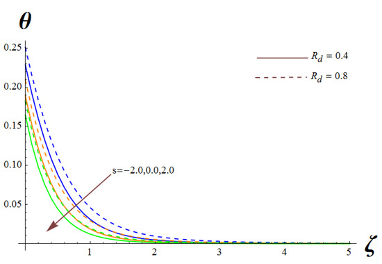 In Equation (4), is termed as the heat coefficient used for thermal-absorption or thermal-generation rendering to or , respectively. Further, the factor recognizes the heat flux at the surface in the form of radiation. The Rosseland approximation for a sufficiently thick optical medium is mentioned as follows: ([1,3,6])