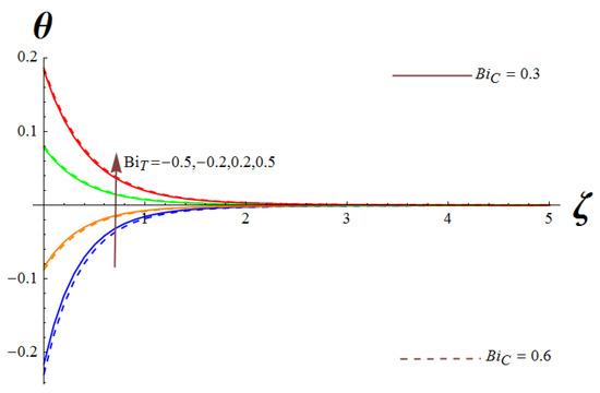 - Temperature distribution rises with a corresponding increase in the values of the heat source, Ludwig–Soret factor, temperature Biot number with an opposite effect for heat sink, stretching parameter, and power indices of r and s.
