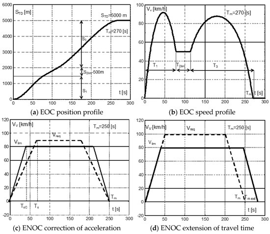 To compare results, the EOC and ENOC (related to Figure 7) travel time of EOC with speed limit was extended from the original Tm1 = 270 s to Tm2 = 286.876 s. Time profiles of this run are shown in Figure 4.