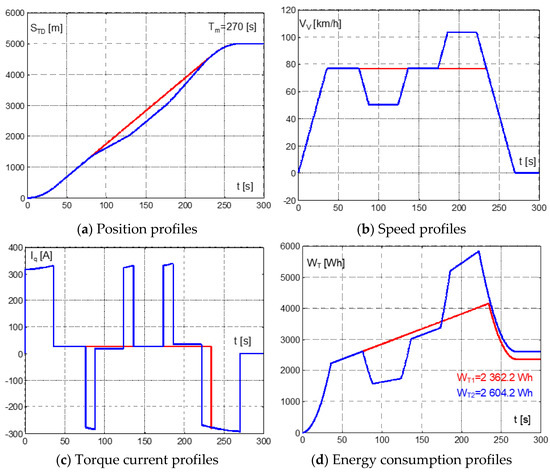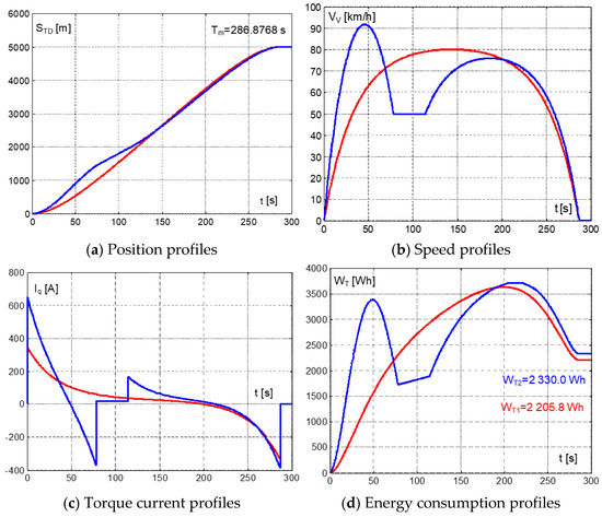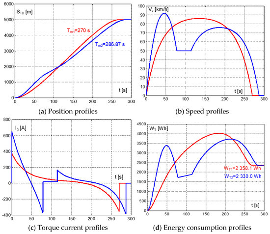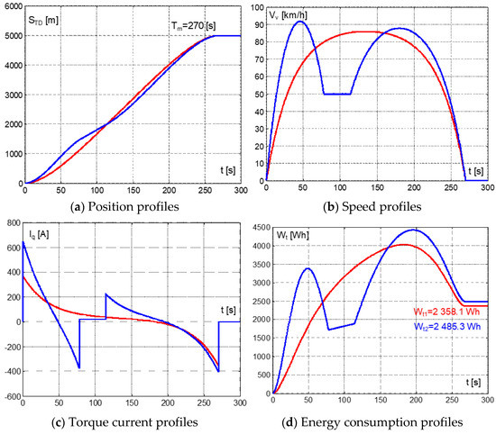 The influence of average speed was verified with a new run (with and without speed limit) for an extended maneuver time, Tm = 269.859 s, the results of which are shown in Figure 8. The simulations confirmed that TM energy consumptions of a run without speed limit dropped to the lowest value, Wt1 = 2219.4 Wh, while the consumption with speed limit stood the same at Wt2 = 2333.1 Wh. This consumption is now 1.31% (113.61 Wh) lower if compared with the speed limit run. Additionally, time functions of speed support the idea of a proportionality of energy consumption to average speed because the cruising speed for the run without speed limit dropped to Vmax1 = 70.86 km/h, while the run with speed limit has the same value, Vmax2 = 76.79 km/h.