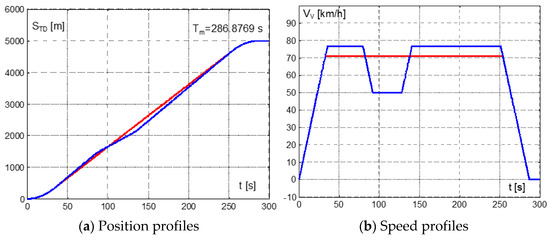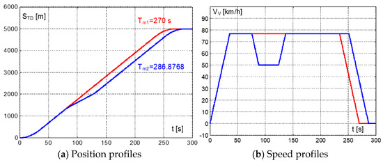 Interesting is energy consumption because there is no reason for its change during a run without speed limit (Wt1 = 2358.1 Wh), while the consumption of a run with speed limit dropped to Wt2 = 2330.0 Wh and is 1.19% lower (28.1 Wh) as compared with a run without speed limit. This difference in energy consumption can be explained with the lower average speed of the run with speed limit. To verify such influence of the prescribed travel time Tm, one more simulation for common travel time, Tm = 286.8768 s, was run and is shown in Figure 5.