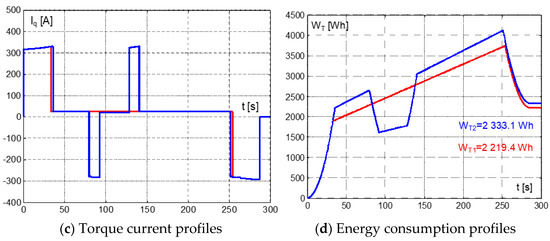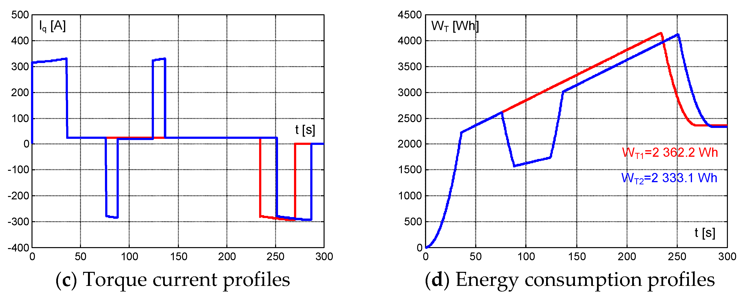 For motoring mode peaks of TM torque current, components were Iq1 = 330.39 A and Iq2 = 339.41 A, which is 2.75% higher for a run with speed limit. In braking mode, both currents’ minimums reached the same value. Iq1 = Iq2 = 292.9 A. The measured total energy consumptions of TM without speed limit were Wt1 = 2362.2 Wh and Wt2 = 2604.2 Wh with speed limit, which means that the speed limit, and following acceleration to a new speed maximum, Vmax2, is 10.24% more energy demanding (242 Wh).