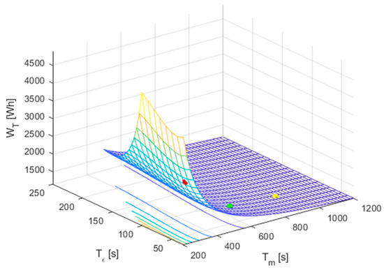Mutual coupling between travel time, Tm; acceleration time, Tε; and their influence on TM total energy consumption for ENOC is shown in Figure 9. As can be seen, the extension of travel time results in lower energy consumption. An example of travel time extension from Tm1 = 600 s to Tm2 = 900 s with Tε1 = 66.46 s and Tε = 75.56 s (green and yellow points, red point is valid for Tm = 270 s) can bring energy savings of 192.9 Wh (WT1 = 1415.7 Wh, WT2 = 1222.8 Wh). Real energy optimal consumption, WTmin = 1052.4 Wh, can be achieved for the travel time Tm = 4100.2 s, which is hardly acceptable for travelers on board as well as a timetable of railway service. Therefore, in general, the maximum speed of the unit should be kept to the minimum practicable values to satisfy passenger demands on the availability, precision, and density of railway service.