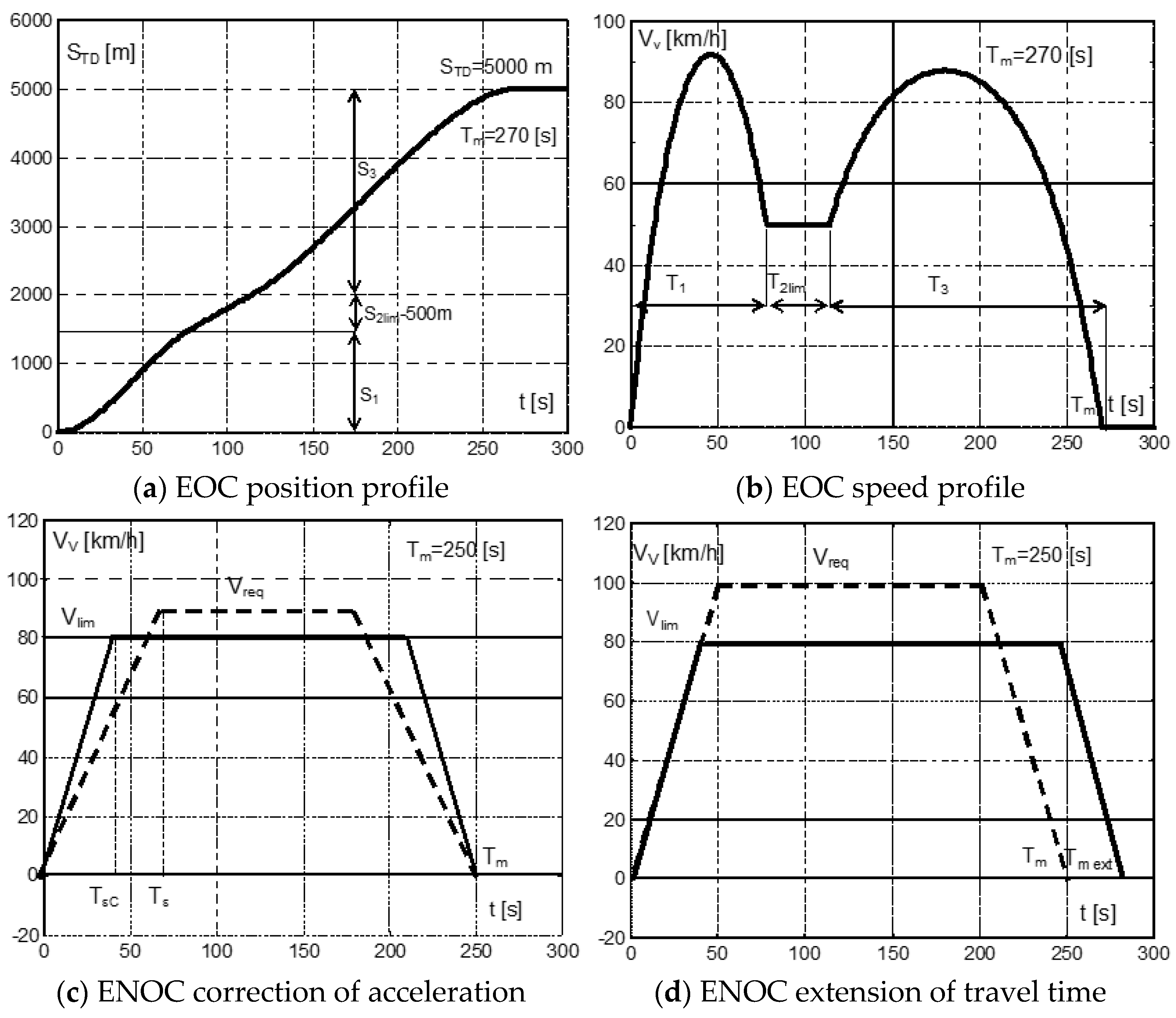 Figure 3a confirms that a required travel distance, STD, was reached by both EOC runs at a prescribed maneuver time, Tm = 270 s. The maximum speed for a journey without speed limit was Vmax1 = 86.06 km/h, while a run with speed limit requires a higher maximum speed, Vmax2 = 91.84 km/h, to keep the prescribed travel time.